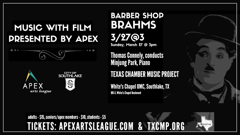 The Apex Arts League and the Texas Chamber Music Project (TXCMP) will present Music and Film on Sunday, March 27, at Southlake's White's Chapel UMC. The performance starts at 3 p.m. The TXCMP will feature a Charlie Chaplin classic film accompanied by the orchestra performing Brahms Hungarian Rhapsody, conducted by Thomas Connely. Connely will also…